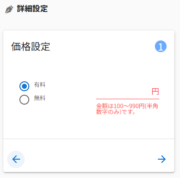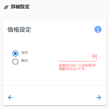 コンテンツの価格設定の上限と下限を教えてください。 有料コンテンツは、100円~3,000円での設定が可能です。 なお、コンテンツの価格設定は、記事の種類によって異なります。 通常記事は 100円~3,000円 の範囲で設定できます。 レース記事(出馬表を使用した記事)は 100円~990円 の範囲で設定できます。 なお、無料コンテンツとして公開する場合は、価格を設定せずに公開できます。