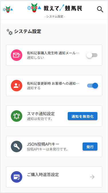 スマホ通知を設定したが、やはりOFFにしたい スマホ通知をOFFにしたい場合は、教えて競馬民の [システム設定] → [スマホ通知設定]から停止できます。設定画面で通知がONになっている場合は、ボタンから解除してください。 なお、端末側ですでに通知許可を出している場合は、ブラウザやホーム画面アプリの通知設定もあわせてOFFにしてください。端末の設定側で通知が許可されたままだと、サービス側で解除しても通知が残る場合があります。